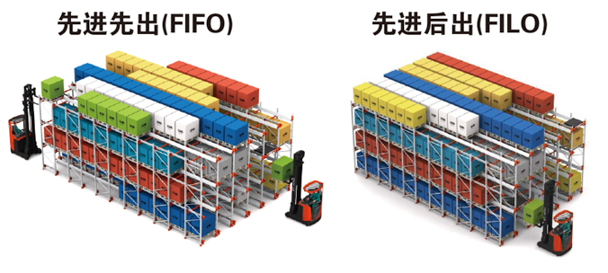 如留有叉車駛?cè)胪ǖ?,則可實現(xiàn)先進(jìn)先出的存儲方式(FIFO)